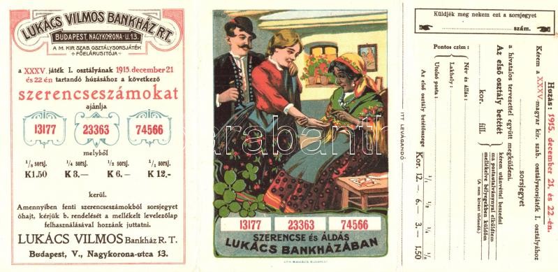 1915 Lukács Vilmos Bankház Rt. kihajtható 3-részes litho reklámlapja. Budapest V. Nagykorona utca 13. / Hungarian bank house 3-tiled foldable litho advertisement card s: Földes
