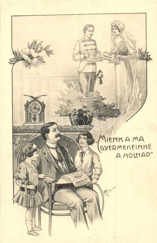 Leírás: Mienk a ma, gyermekeinké a holnap. Generali Triesti Általános Biztosító Társulat reklámlapja / Insurance company's advertisement card s: F. Ritter (vágott / cut)