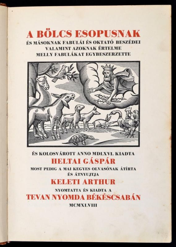 A Bölcs Esopusnak és másoknak fabulái és oktató beszédei, valamint azoknak értelme melly fabulákat egybeszerzette és Kolosvárott anno MDLXVI. kiadta Heltai Gáspár, most pedig a mai kegyes olvasónak átírta és átnyujtja Keleti Arthur.