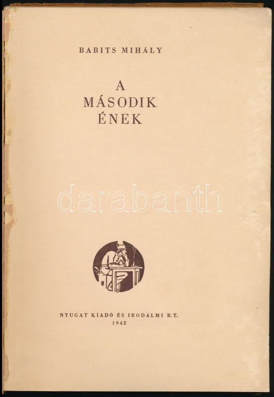 Babits Mihály: A második ének. Bp., 1942, Nyugat Kiadó és Irodalmi Rt. Kiadói papírkötés. Első kiadás. Számozott (2000/1501.) példány. Kiadói papírkötés, a külső boríték hiányzik.