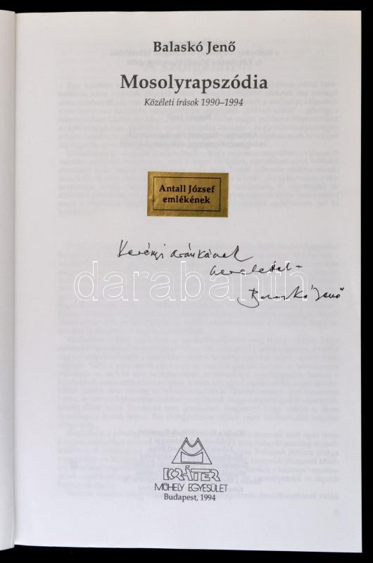 Balaskó Jenő: Mosolyrapszódia. Közéleti írások 1990-1994. Bp., 1994, K... https://www.darabanth.com/hu/313-Gyorsarveres/313.0/Konyvek/Konyvek-Egyeb-ritkasagok~400014/Balasko-Jeno-Mosolyrapszodia-Kozeleti-irasok-1990-1994-Bp-1994-Krater-A-szerzo-alta~II1621574
