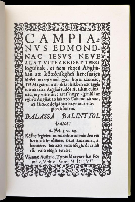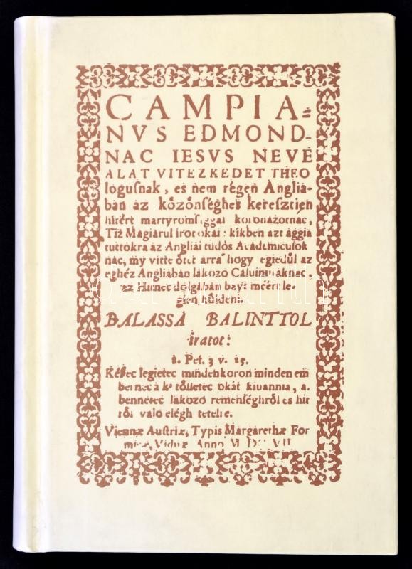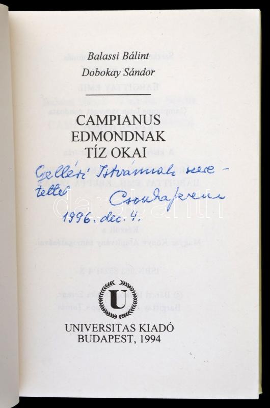 Balassi Bálint-Dobokay Sándor: Campianus Edmondnak tíz okai. Az 1607. évi bécsi kiadás hasonmása. Bp., 1994, Universitas Kiadó. Kiadói kartonált papírkötésben. Megjelent 600 példányban. Csonka Ferenc (1916-2000) irodalomtörténész, műfordító, klasszika-filológus által dedikált példány! A könyvben megtalálható Balassi Bálint utolsó műve, Campianus hitvitájának fordítása, az eredeti latin szöveg prágai kiadása és négy kísérő tanulmány.