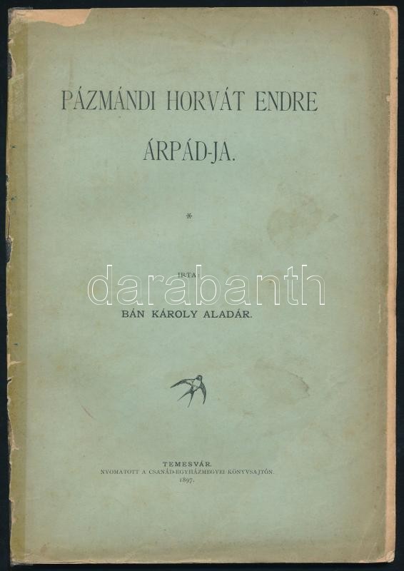Bán Károly Aladár: Pázmándi Horvát Endre Árpád-ja. Temesvár, 1897, Csanád-Egyházmegyei Könyvsajtó, 68 p. Kiadói ragasztott borítójú papírkötés, de belül jó állapotban.