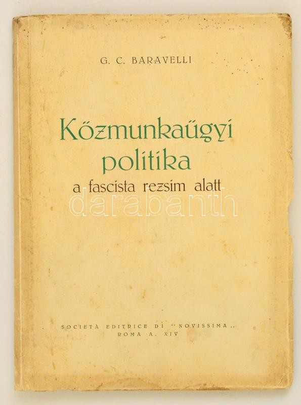 Baravelli, G. C.: Közmunkaügyi politika a fascista rezsim alatt. Róma,... https://www.darabanth.com/hu/313-Gyorsarveres/313.0/Konyvek/Konyvek-Egyeb-ritkasagok~400014/Baravelli-G-C-Kozmunkaugyi-politika-a-fascista-rezsim-alatt-Roma-1935-Novissima-Kicsit-~II1717683