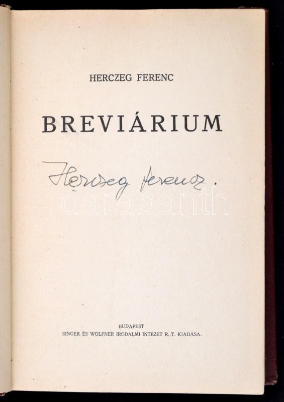 Leírás: Herczeg Ferenc Breviárium. Bp.,1932, Singer és Wolfner. Kiadói aranyozott egészvászon-kötés, sérült gerinccel. Herczeg Ferenc aláírásával.