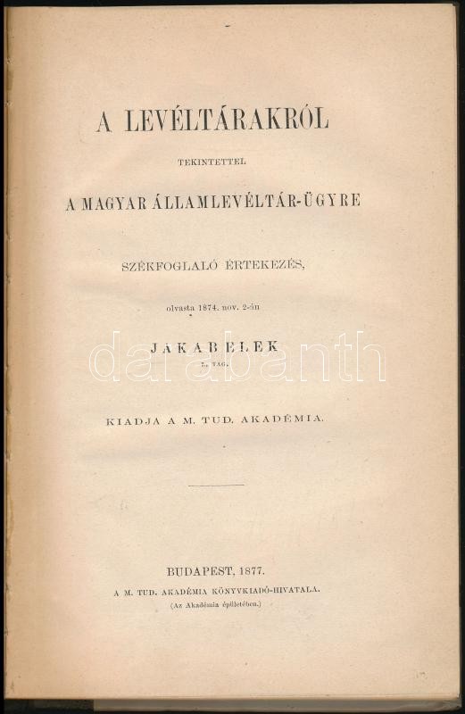 Jakab Elek: A levéltárakról tekintettel a magyar államlevéltár-ügyre. Székfoglaló értekezés. Bp.,1877, MTA, (Athenaeum), 190+1 p. Átkötött félvászon-kötés, jó állapotban.