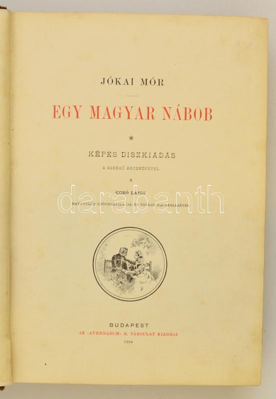 Jókai Mór: Egy magyar nábob. Képes díszkiadás. Goró Lajos hatvankét szövegrajzával, és nyolc aquarelljével.Bp., 1894, Athenaeum, 1 t.+XII+500+2 p.+ 8 t. Kiadói aranyozott, dombornyomásos egészvászon-kötésben, gerincen sérüléssel