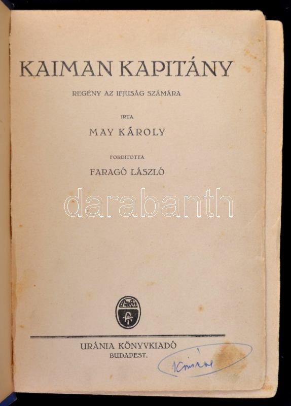 May Károly: Kaiman kapitány. Fordította: Faragó László. Bp., é.n., Urá... https://www.darabanth.com/hu/313-Gyorsarveres/313.0/Konyvek/Konyvek-Egyeb-ritkasagok~400014/May-Karoly-Kaiman-kapitany-Forditotta-Farago-Laszlo-Bp-en-Urania-Kiadoi-aranyozot~II1717654