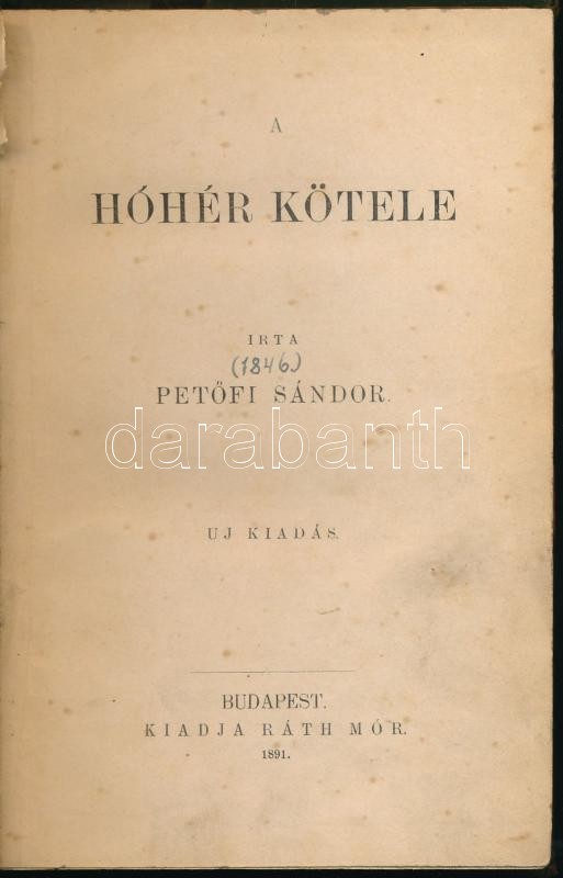 Leírás: Petőfi Sándor: A hóhér kötele. Bp., 1891, Ráth Mór. Átkötött korabeli félvászon-kötés, sérült, javított gerinccel, kopottas borítóval.