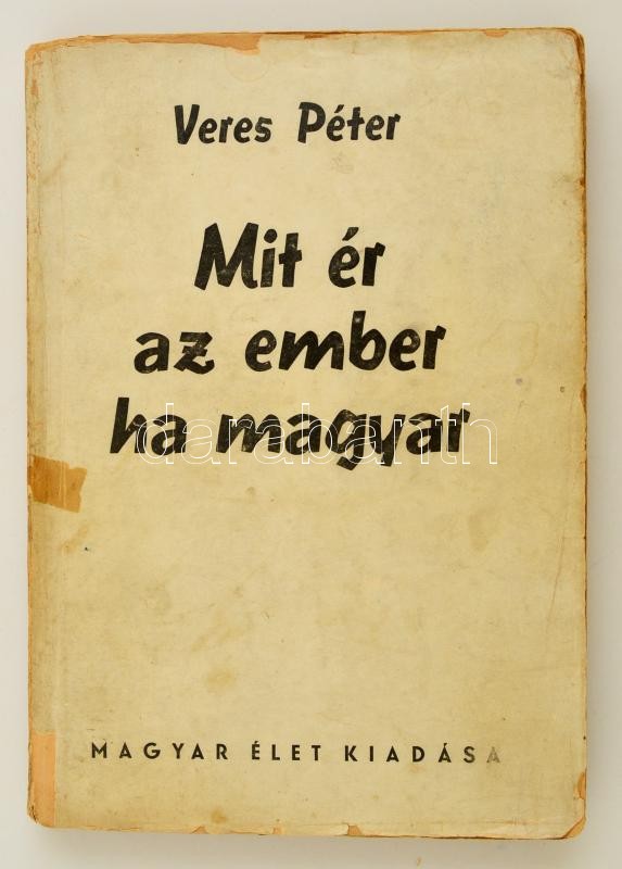 Veres Péter: Mit ér az ember, ha magyar. Levelek egy parasztfiúhoz. Bp., (1941), Magyar Élet. Második kiadás. Kiadói papírkötésben, kissé viseltes papírborítékkal, a hátsó papírboríték hiányzik,, az elülső része részben elvált a borítótól, a címoldaltól a 14-ig oldalig a lapok kijárnak.