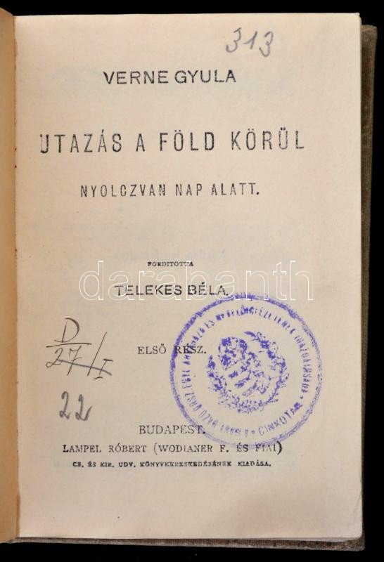 Verne Gyula: Utazás a föld körül nyolcvan nap alatt. Fordította Telekes Béla. Bp.,é.n., Lampel R. (Wodianer F. és Fiai), 158+111+1 p. Kiadói egészvászon-kötés, intézményi bélyegzővel.