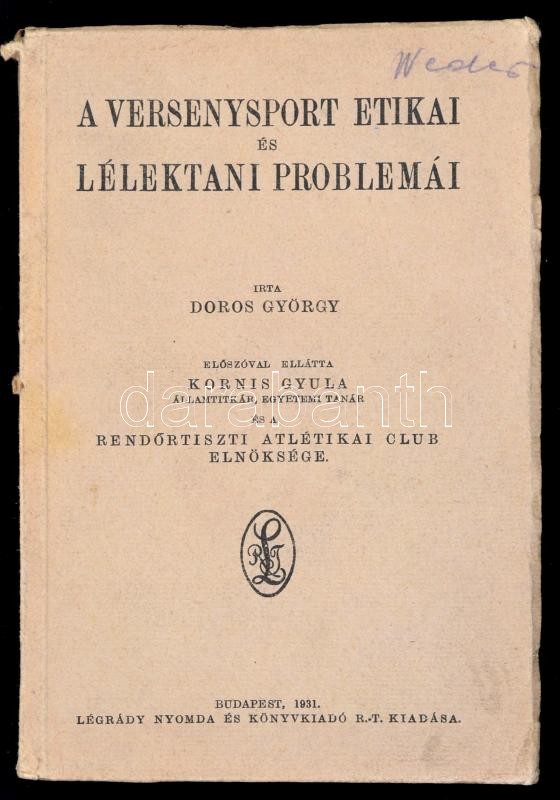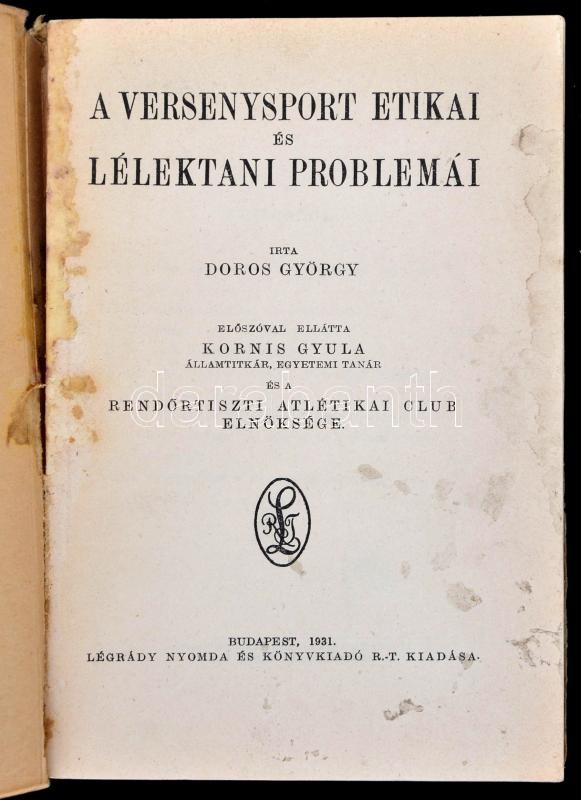 Doros György: A versenysport etikai és lélektani problémái. Előszóval ellátta Kornis Gyula és a Rendőrtiszti Atlétikai Club elnöksége. Bp.,1931, Légrády Nyomda és Könyvkiadó Rt. Kiadói papírkötés, könyvtest kissé elvált.