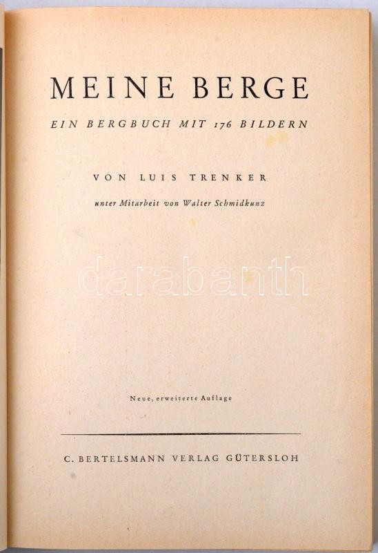 Luis Trenker: Meine Berge. Gütersloh, 1951, C. Bertelsmann, 154 p. Kiadói egészvászon kötés. Számos fekete-fehér képpel illusztrálva. Luis Trenker: Hegyem, német nyelven. / Linen-binding, in german language.
