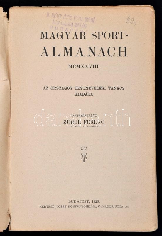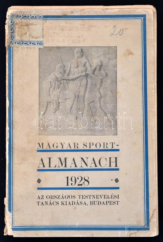 Magyar Sportalmanach 1928. Szerk.: Zuber Ferenc. Az Országos Testnevelési Tanács kiadása. Bp.,1929, Kertész József Könyvnyomdája. Kiadói papírkötés, sérült gerinccel, foltos, kissé szakadt borítóval, intézményi bélyegzővel.