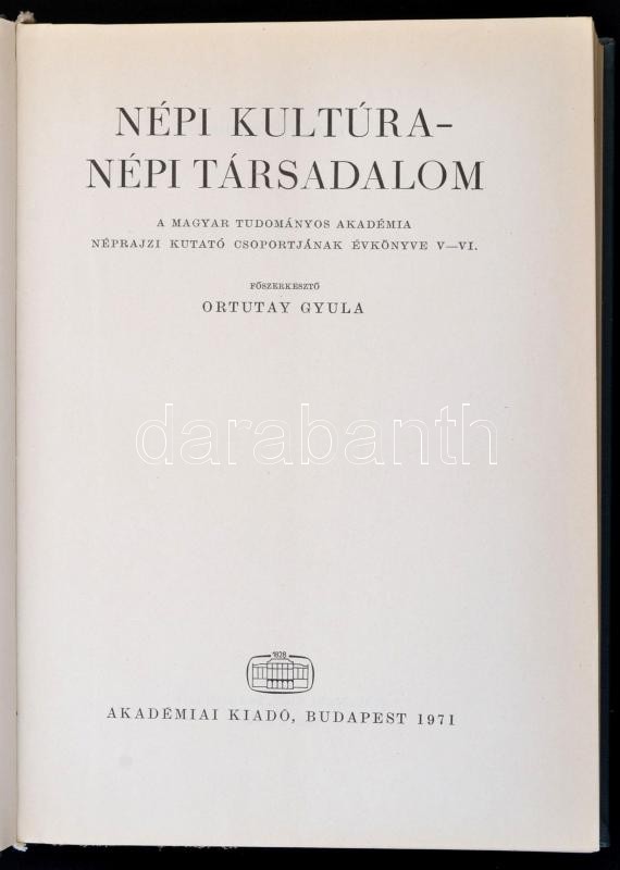 Népi kultúra - Népi társadalom. MTA Néprajzi Kutató Csoportjának évkönyve V-VI. kötet. Szerk.: Ortutay Gyula. Bp., 1971, Akadémia kiadó. Kiadói egészvászon-kötés.