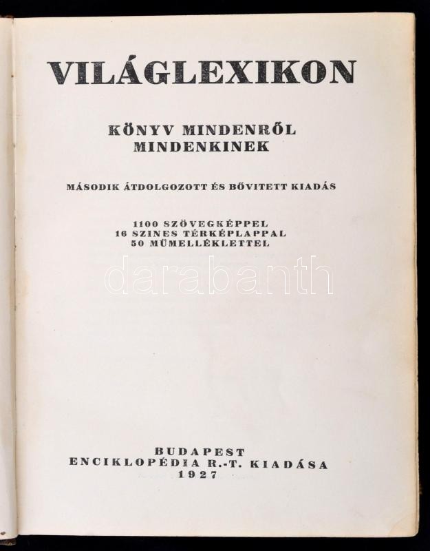 Világlexikon. Könyv mindenről mindenkinek. Budapest, 1927, Enciklopédia Rt. Kiadása. Második, átdolgozott és bővített kiadás. Kiadói aranyozott gerincű félbőr kötésben, kopottas