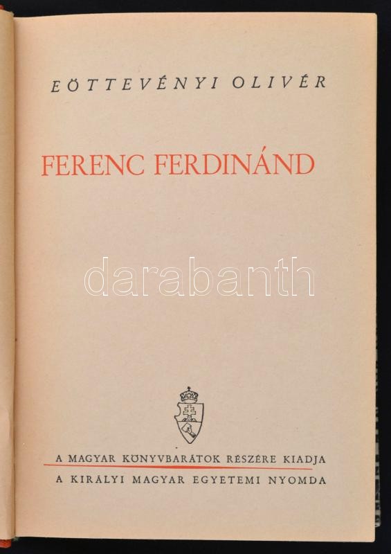 Eöttevényi Olivér: Ferenc Ferdinánd. Bp.,(1942),Kir. Magyar Egyetemi N... https://www.darabanth.com/hu/313-Gyorsarveres/313.0/Konyvek/Konyvek-Tortenelem~400015/Eottevenyi-Oliver-Ferenc-Ferdinand-Bp-1942-Kir-Magyar-Egyetemi-Nyomda-391-p-Kiadoi-aran~II1717282