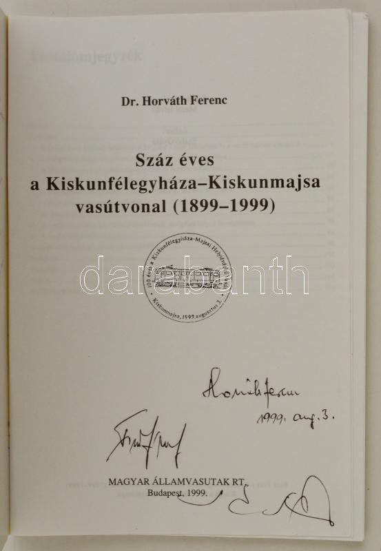 Horváth Ferenc: Száz éves a Kiskunfélegyháza-Kiskunmajsa vasúrvonal (1899-1999). Bp., 1999, MÁV. A szerző dedikációjával. Papírkötésben, jó állapotban.