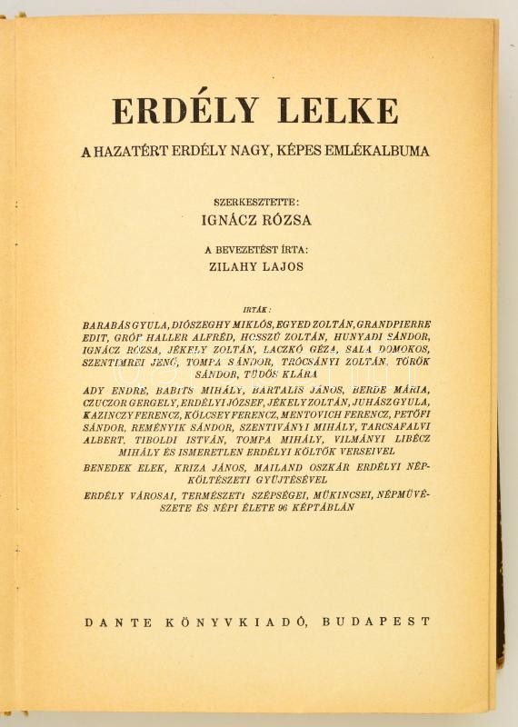 Erdély lelke. A hazatért Erdély nagy, képes emlékalbuma. Szerkesztette Ignácz Rózsa. A bevezetést Ãrta Zilahy Lajos. Bp., 1940, Dante Könyvkiadó. Fekete-fehér képekkel illusztrált. Kiadói kopott félvászon-kötésben, jó állapotban.