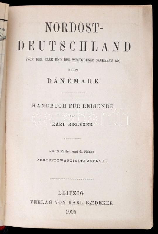 Karel Baedeker: Nordost-Deutschland (Von der Elbe und der Westgrenze Sachsens an) Nebst Danemark. Leipzig, 1905, Karl Baedeker, XXX+462 p. 28. kiadás. Kiadói aranyozott egészvászon-kötés, német nyelven, térképekkel illusztrálva./ Karel Baedeker: Nordost-Deutschland (Von der Elbe und der Westgrenze Sachsens an) Nebst Danemark. Leipzig, 1905, Karl Baedeker, XXX+462 p. Twenty-eighth edition. Linen-binding, in German language, with maps.