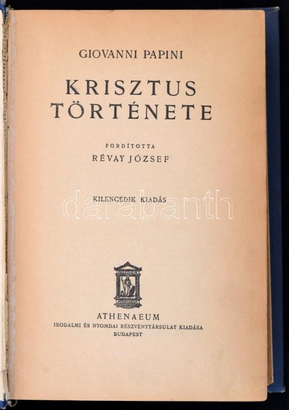 Leírás: Giovanni Papini: Krisztus története. Fordította: Révay József. Bp., é.n., Athenaeum. Kiadói kopottas egészvászon-kötés, hiányzó elülső előzéklappal.