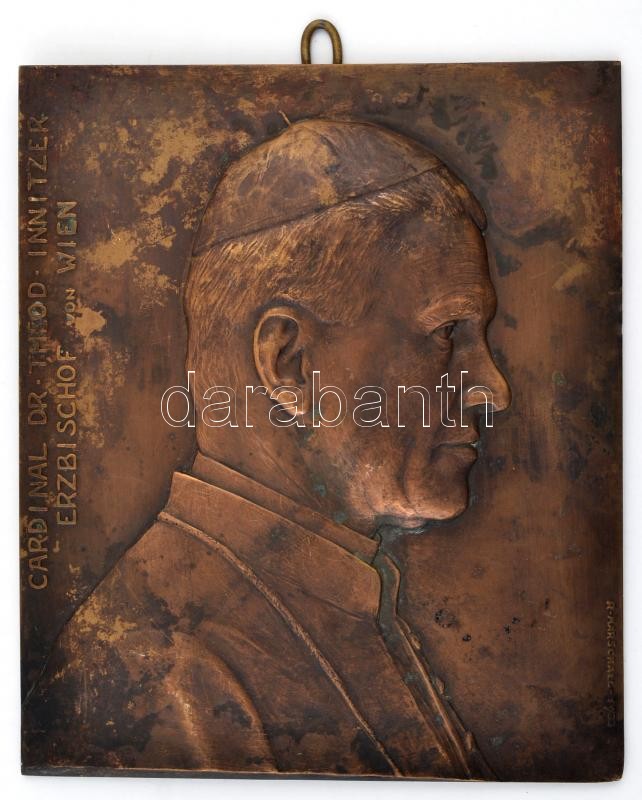 Austria 1933. "Cardinal Dr. Theod. Innitzer Erzbischof von Wien" marked Br plaque, with hanger. Sign.: Rudolf Marschall (220x185mm) C:XF,VF bent plate, patina