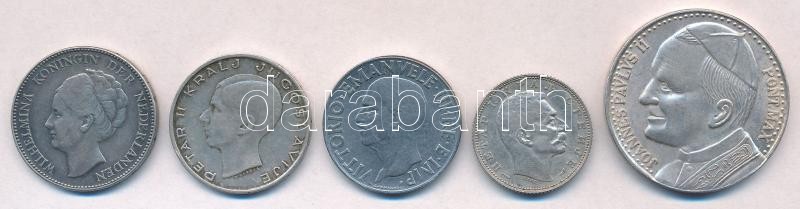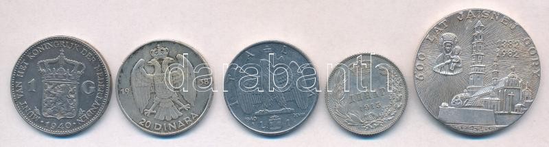 Vegyes: Hollandia 1940. 1G Ag "I. Vilma" + Jugoszlávia 1938. 20D Ag "II. Péter" + Olaszország 1940R 1L acél, mágneses + Szerbia 1915. 1D Ag "I. Péter" + Lengyelország 1982. "II. János Pál pápa / 600 éves a Jasna Góra-i kolostor 1382-1982" ezüstözött fém emlékérem (35mm) T:2 patina