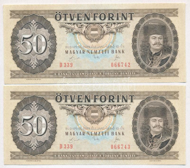 1989. 50Ft (2x) sorszámkövetők T:I Adamo F25 https://www.darabanth.com/hu/313-Gyorsarveres/313.0/Numizmatika/Magyar-bankjegyek~300007/1989-50Ft-2x-sorszamkovetok-TI-Adamo-F25~II1718184