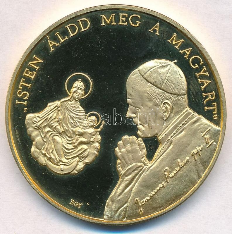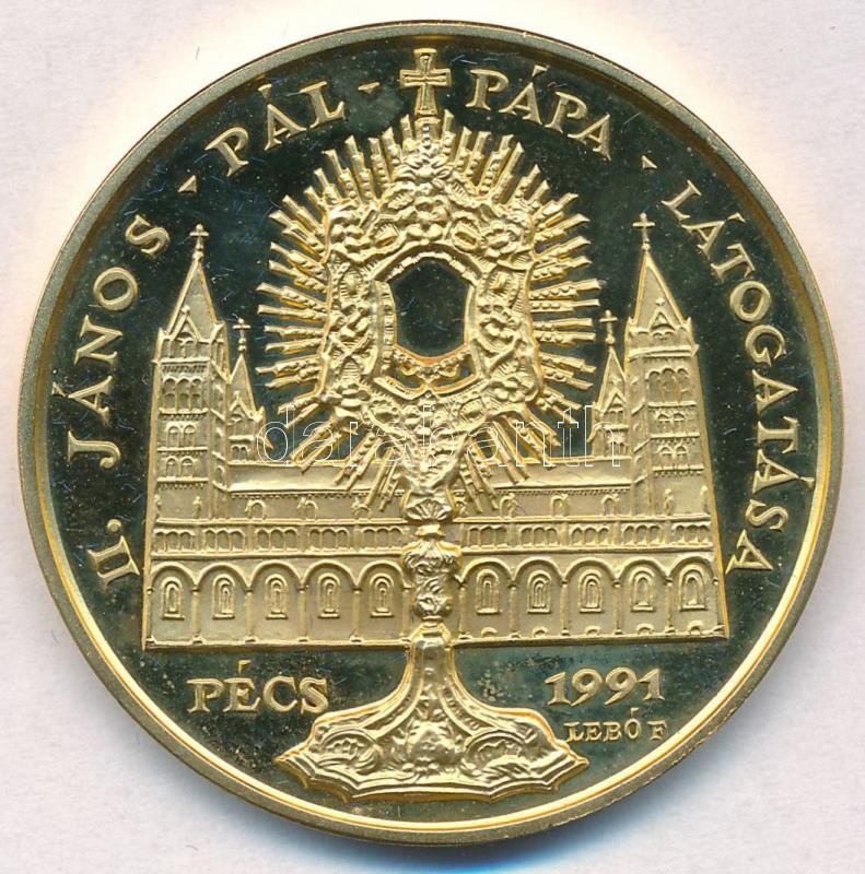 Leírás: Bognár György (1944-) / Lebó Ferenc (1960-) 1991. "II. János Pál pápa látogatása - Pécs" aranyozott fém emlékérem, műanyag tokban (42,5mm) T:1-(PP)