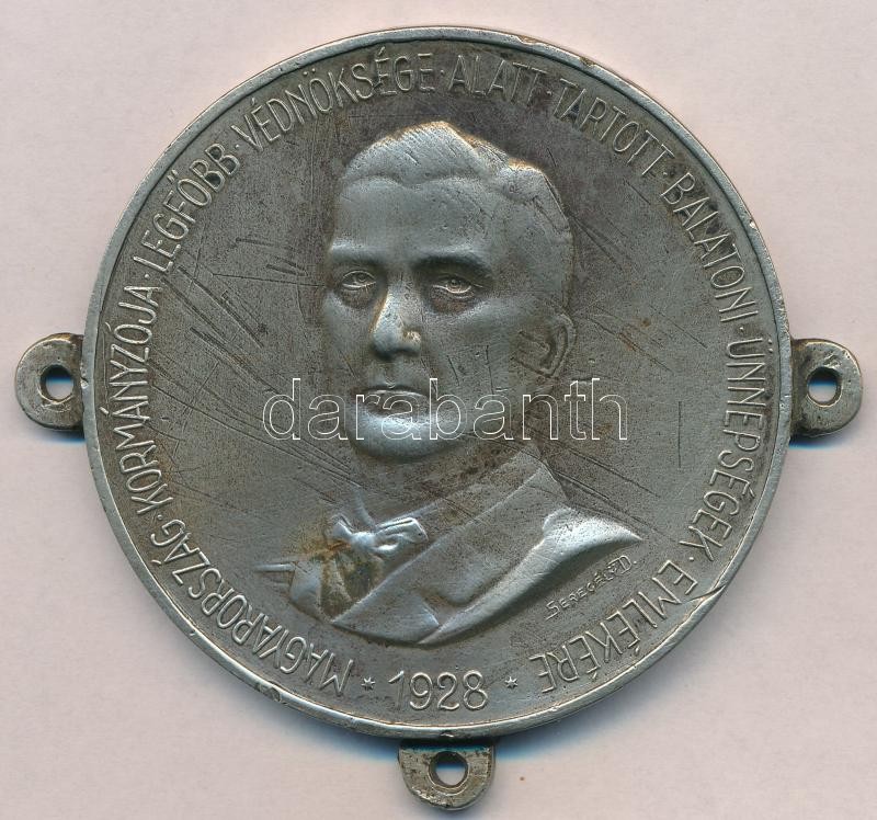 Seregély Dezső (1867-1948) 1928. "Magyarország kormányzója legfőbb védnöksége alatt tartott Balatoni Ünnepségek emlékére" fém emlékérem, három rögzítésre szolgáló füllel, hátoldala lecsiszolva (75mm) T:2-,3 k.