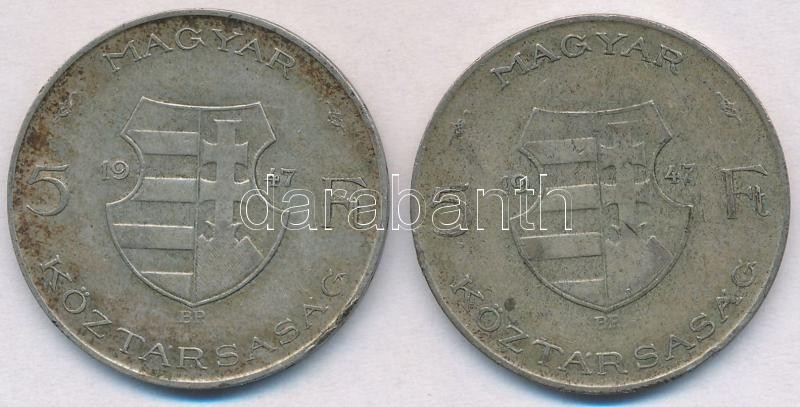 1947. 5Ft Ag "Kossuth" (2x) T:2-,3 patina https://www.darabanth.com/hu/313-Gyorsarveres/313.0/Numizmatika/Magyar-es-magyar-verdejelu-fem-es-ezustpenzek~300008/1947-5Ft-Ag-Kossuth-2x-T2-3-patina~II1711598