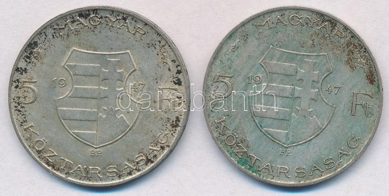 1947. 5Ft Ag "Kossuth" (2x) T:2-,3 patina https://www.darabanth.com/hu/313-Gyorsarveres/313.0/Numizmatika/Magyar-es-magyar-verdejelu-fem-es-ezustpenzek~300008/1947-5Ft-Ag-Kossuth-2x-T2-3-patina~II1711604