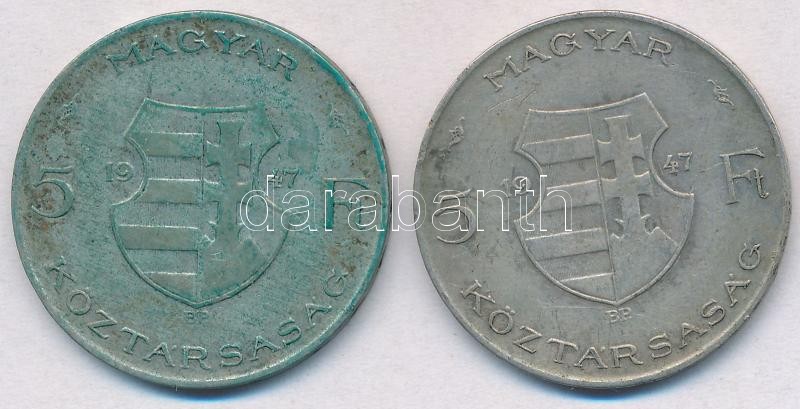 1947. 5Ft Ag "Kossuth" (2x) T:2-,3 patina https://www.darabanth.com/hu/313-Gyorsarveres/313.0/Numizmatika/Magyar-es-magyar-verdejelu-fem-es-ezustpenzek~300008/1947-5Ft-Ag-Kossuth-2x-T2-3-patina~II1711606