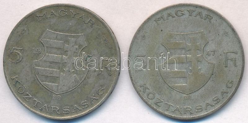 1947. 5Ft Ag "Kossuth" (2x) T:2-,3 patina https://www.darabanth.com/hu/313-Gyorsarveres/313.0/Numizmatika/Magyar-es-magyar-verdejelu-fem-es-ezustpenzek~300008/1947-5Ft-Ag-Kossuth-2x-T2-3-patina~II1716595