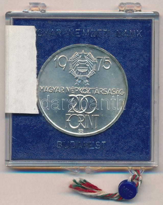 Leírás: 1975. 200Ft Ag "Felszabadulás" eredeti, sérült, plombált MNB plasztiktokban T:BU ragasztásnyom a tokon