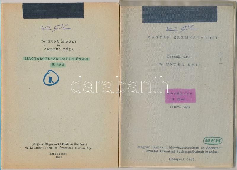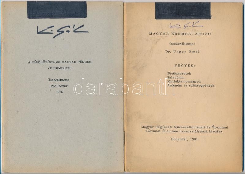 Leírás: 9db éremhatározó füzet, nagyrészt Unger Emil összeállításai, valamint Pohl Artur: A későközépkori magyar pénzek verdejegyei.