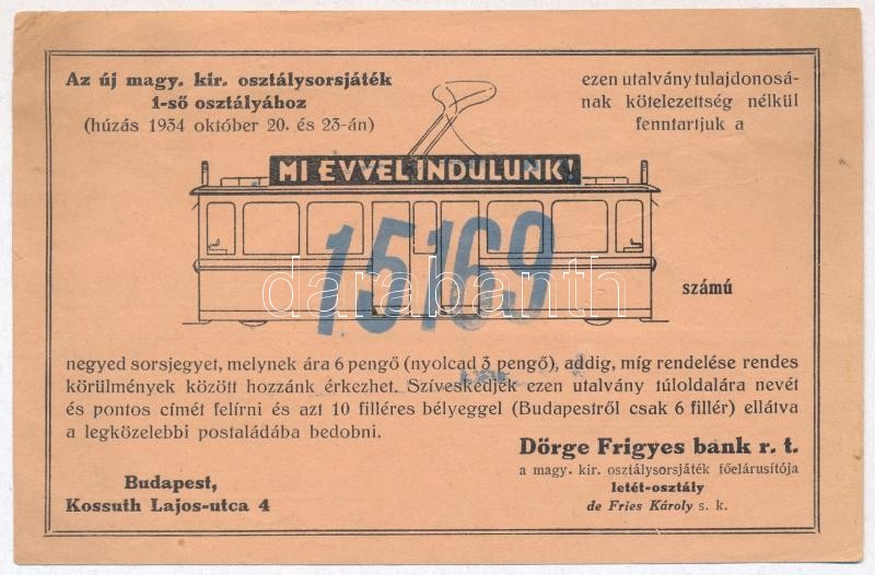 Leírás: Budapest 1934. "Mi evvel indulunk!" sorsjegy rendelőlap "Dörge Frigyes bank r.t." kiadásában, sorszámozott T:II-,III