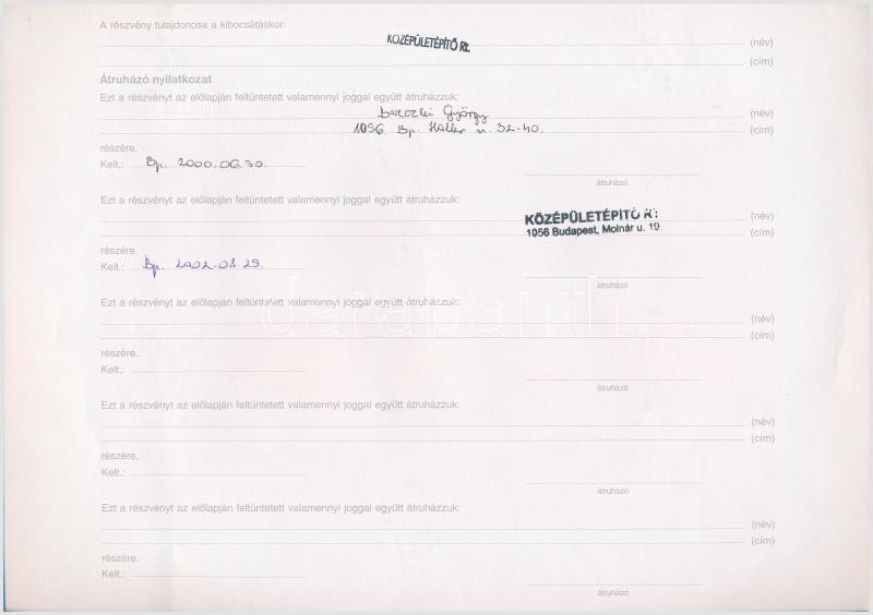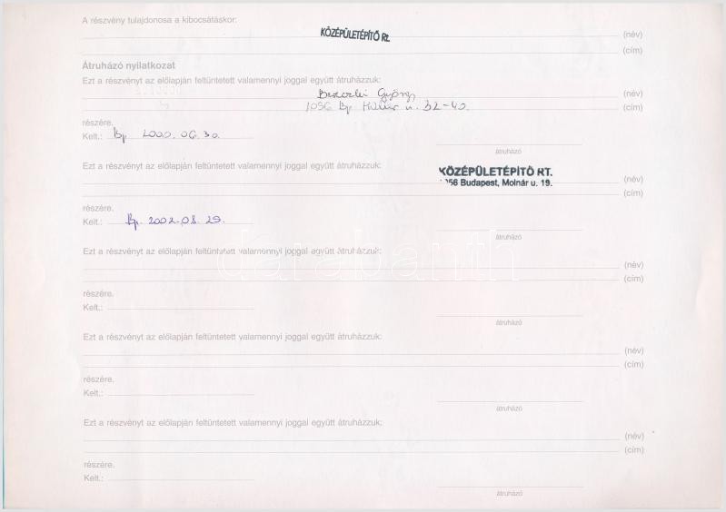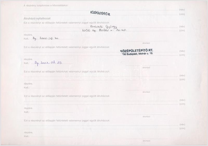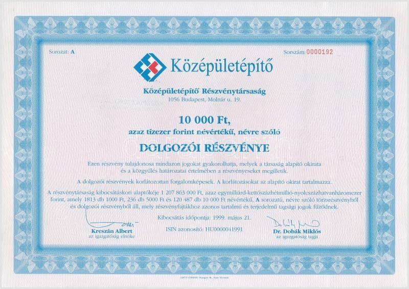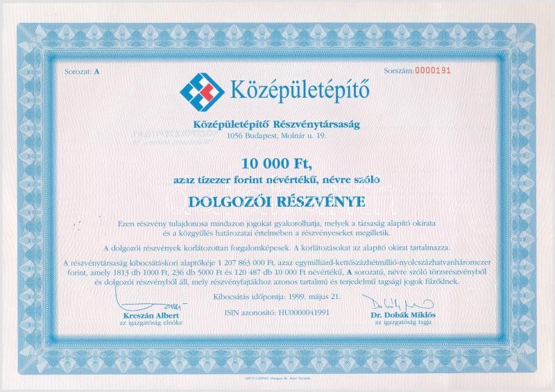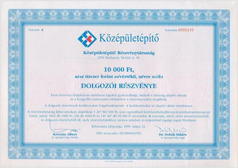Leírás: Budapest 1999. "Középületépítő Részvénytársaság" névre szóló dolgozói részvénye 10.000Ft értékben (3x) sorszámkövetők, mindhárom hátoldala részben kitöltve, bélyegzéssel T:I,I-