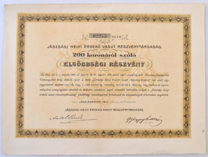 Leírás: Jászladány 1911. "Jászsági Helyi Érdekü Vasut Részvénytársaság" részvénye 200K-ról T:II