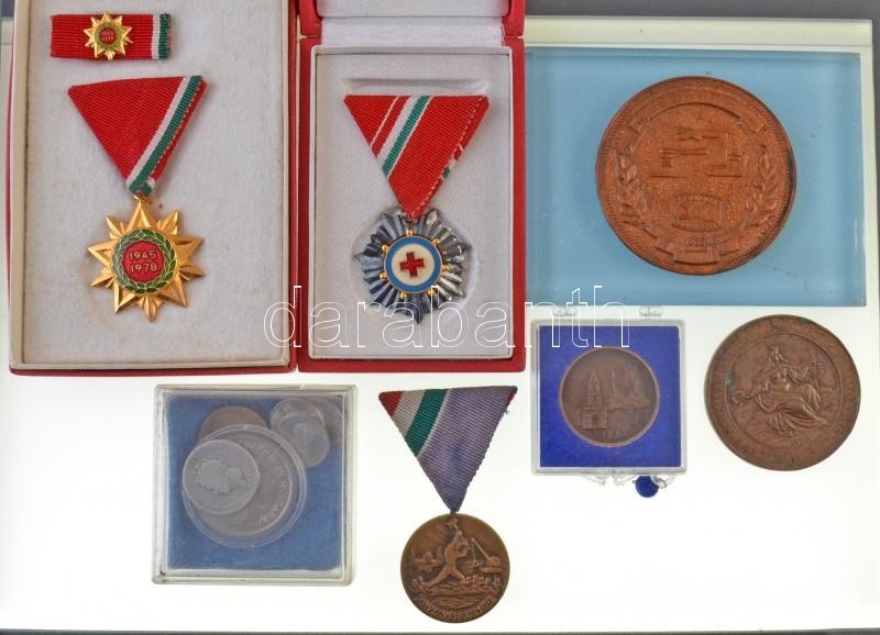 ~12db-os vegyes emlékérem, kitüntetés és fémpénz tétel, közte Nagy-Britannia 1826. 6p Ag "IV. György" (5,26g/0.925) + Német Birodalom 1895. "Berlini Nemzetközi Művészeti és Ipar KiállÃtás" Br emlékérem (51mm) + ~1970- "Vöröskeresztes munkáért" ezüst fokozata, zománcozott, ezüstözött Br kitüntetés mellszalagon, kitűzÅ‘vel, tokban T:vegyes