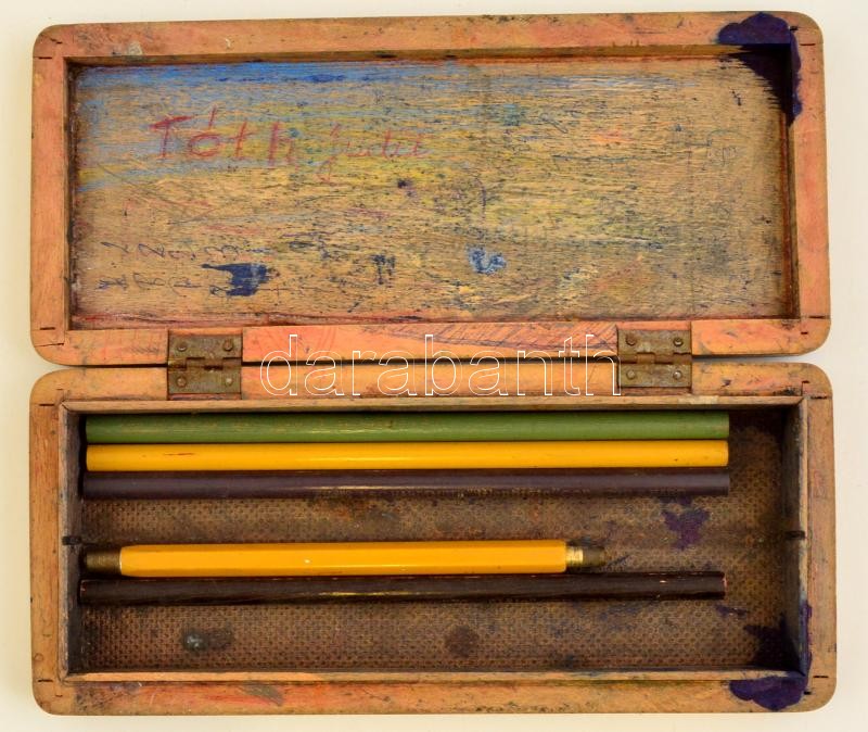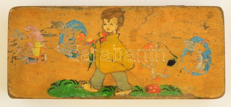 Leírás: Festett fa tolltartó, benne ceruzákkal, kopott, 22×9,5×3 cm