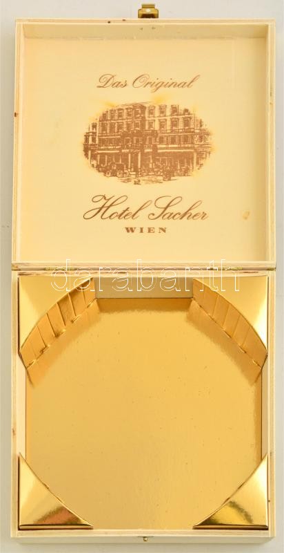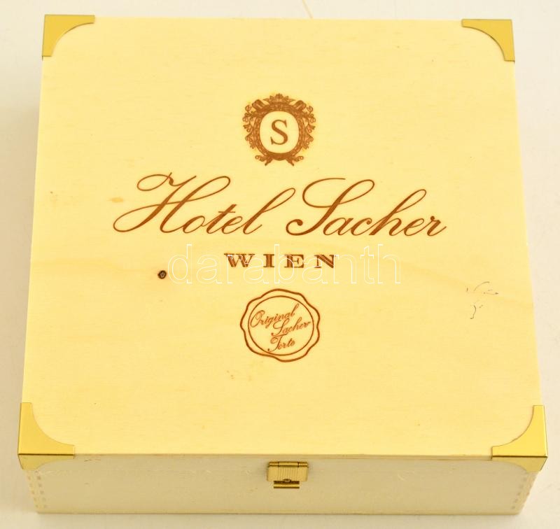 "Hotel Sacher Wien" feliratú díszes fa doboz, 19×19×6,5 cm https://www.darabanth.com/hu/314-Gyorsarveres/314.0/Festmeny-mutargy-papirregiseg-egyeb/Bolhapiac~100011/Hotel-Sacher-Wien-feliratu-diszes-fa-doboz-19C39719C3976-5-cm~II1690434