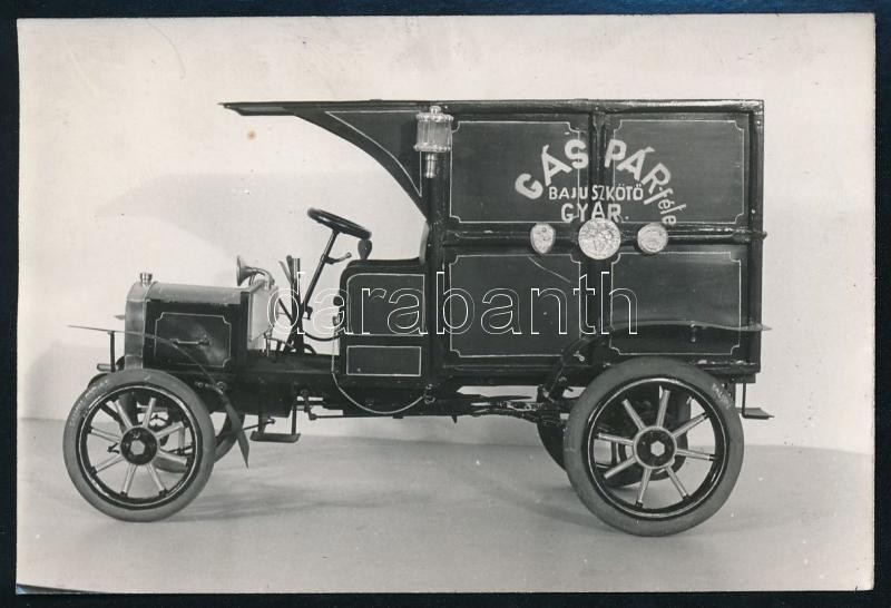 Leírás: 1902 Gáspár-féle Bajuszkötő Gyár autója, későbbi előhívás, hátoldalon feliratozva, 6,5x10 cm