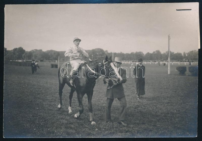 Leírás: 1914 Bécs, Szemere Miklós lova, Confusionárius győzött Vargával a nyeregben, korabeli sajtófotó hozzátűzött szöveggel, 12x16 cm