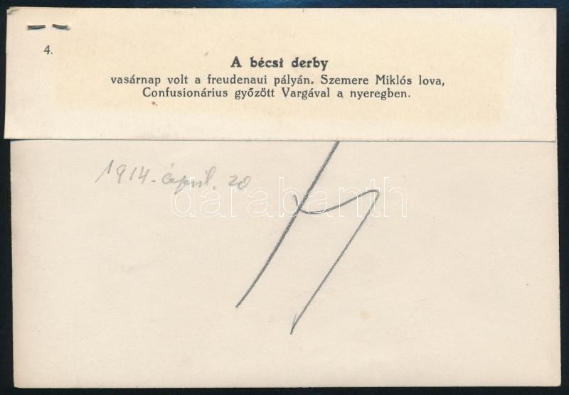1914 Bécs, Szemere Miklós lova, Confusionárius győzött Vargával a nyer... https://www.darabanth.com/hu/314-Gyorsarveres/314.0/Festmeny-mutargy-papirregiseg-egyeb/Foto~100019/1914-Becs-Szemere-Miklos-lova-Confusionarius-gyozott-Vargaval-a-nyeregben--korabeli-sajtof~II1724377