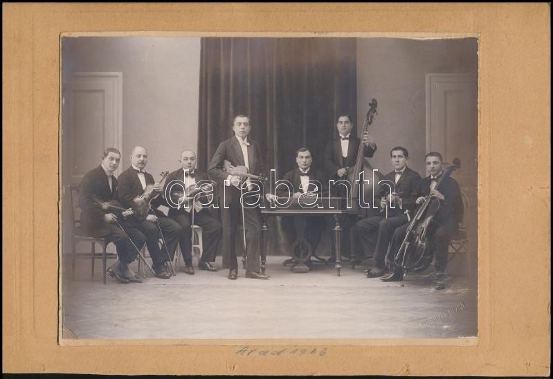 1916 Arad, Nyolctagú zenekar, Steinitzer Dezső műterméből, kartonra ka... https://www.darabanth.com/hu/314-Gyorsarveres/314.0/Festmeny-mutargy-papirregiseg-egyeb/Foto~100019/1916-Arad-Nyolctagu-zenekar-Steinitzer-Dezso-mutermebol-kartonra-kasirozva-hidegpecsettel~II1722500