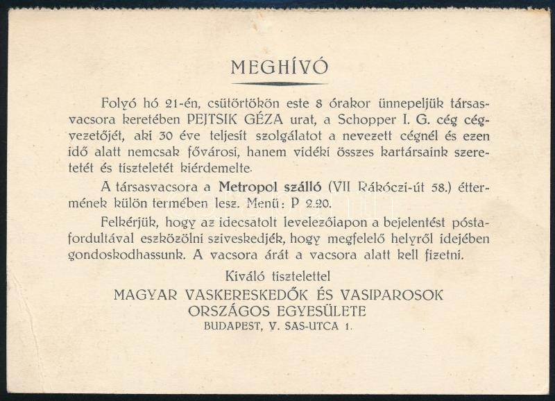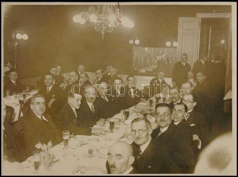 1935 Magyar Vaskereskedők és Vasiparosok Országos Egyesületének társasvacsoráján készült fotó és az esemény meghívója, Kaulich Rudolf fotoriporter, 18x24 cm
