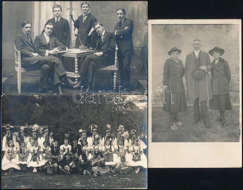 Leírás: cca 1918-1930 Vegyes témájú fotólapok (társaság díszmagyarban, zenészek, keszthelyi társaság), 3 db, 9x13 cm