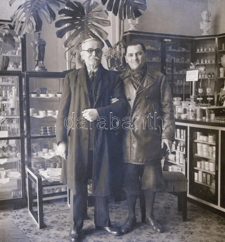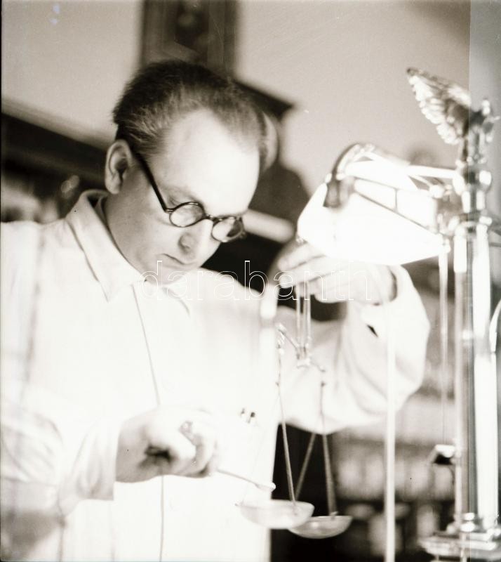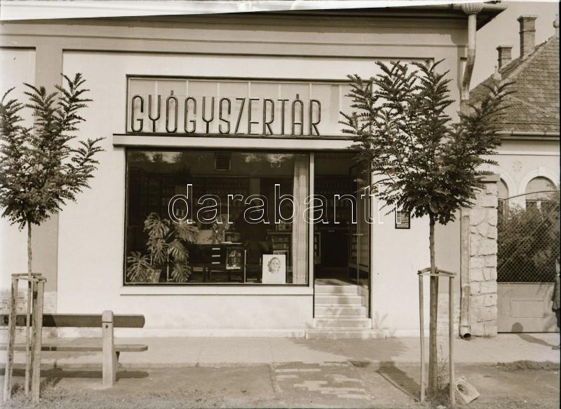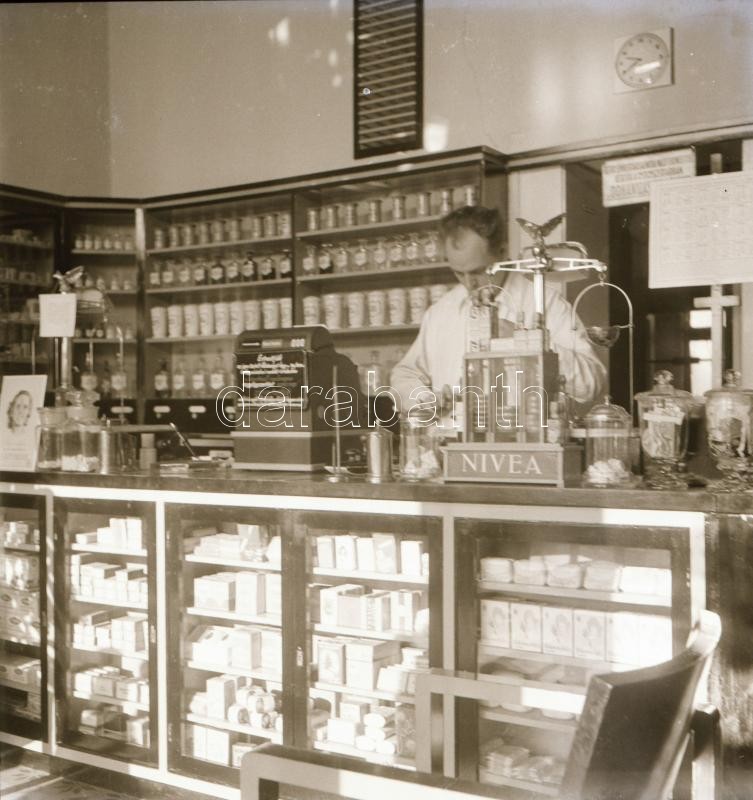 cca 1934 Békéscsaba, a Thöresz-féle gyógyszertár kívül-belül, 13 db szabadon felhasználható, vintage negatív Thöresz Dezső (1902-1963) békéscsabai gyógyszerész és fotóművész hagyatékából, 6x6 cm