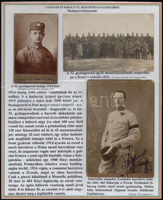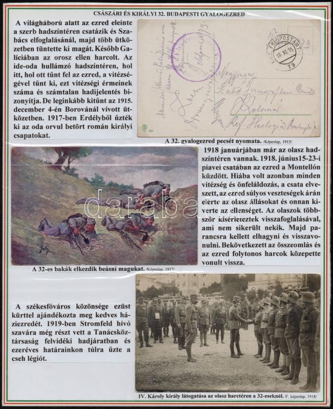 1914-16 Cs. és k. 32. budapesti gyalogezred, Budapest háziezredének története. 8 db eredeti fitó, fotólap, képeslap, egyiken Károly királlyal nemzetiszÃn tablón (nem felragasztva) kÃsérÅ‘ szöveggel / Budapest infantry 8 military photos (not glued)